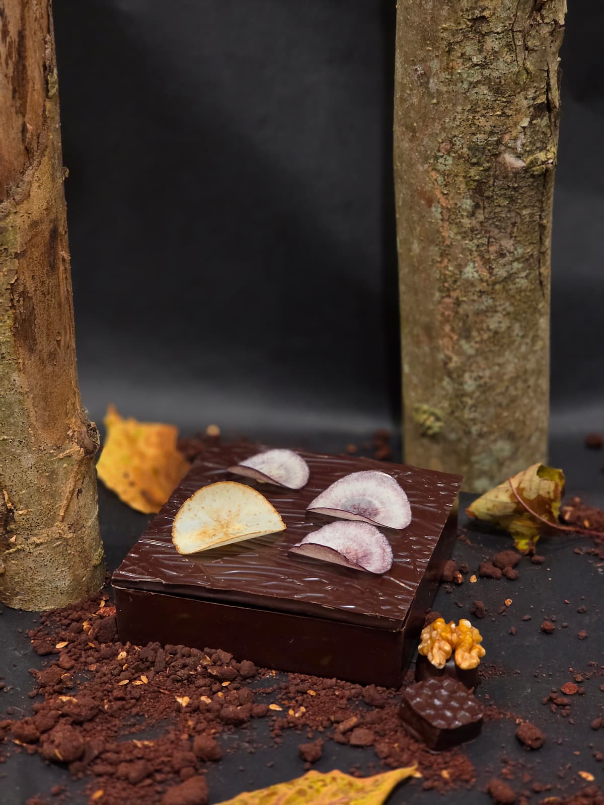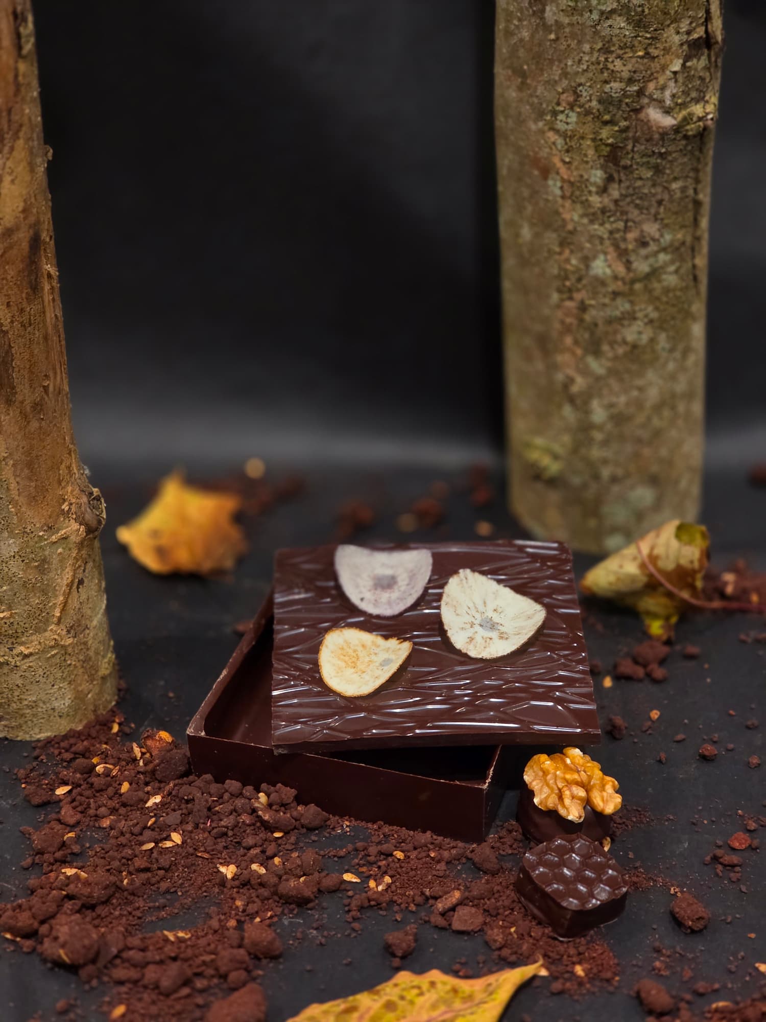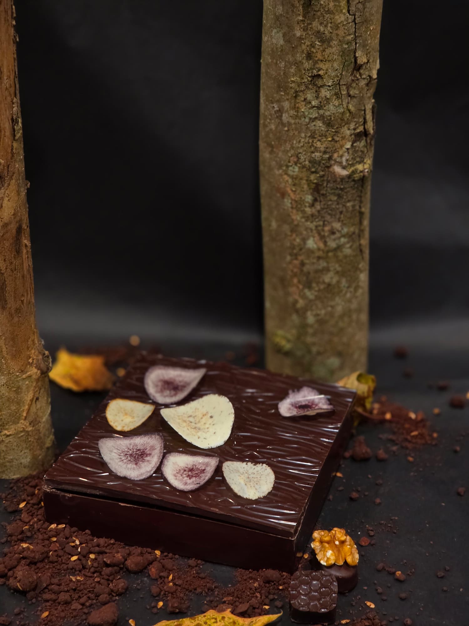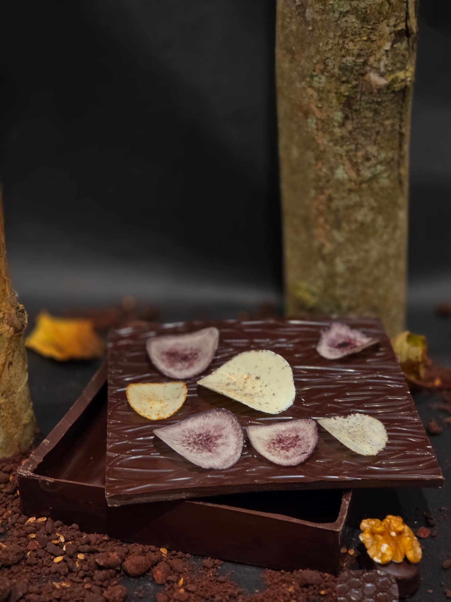 Chocolat noir, fleurs comestibles séchées, Hibiscus, pigments alimentaires, poivre Voatsiperifery de Madagascar, praliné, vanille