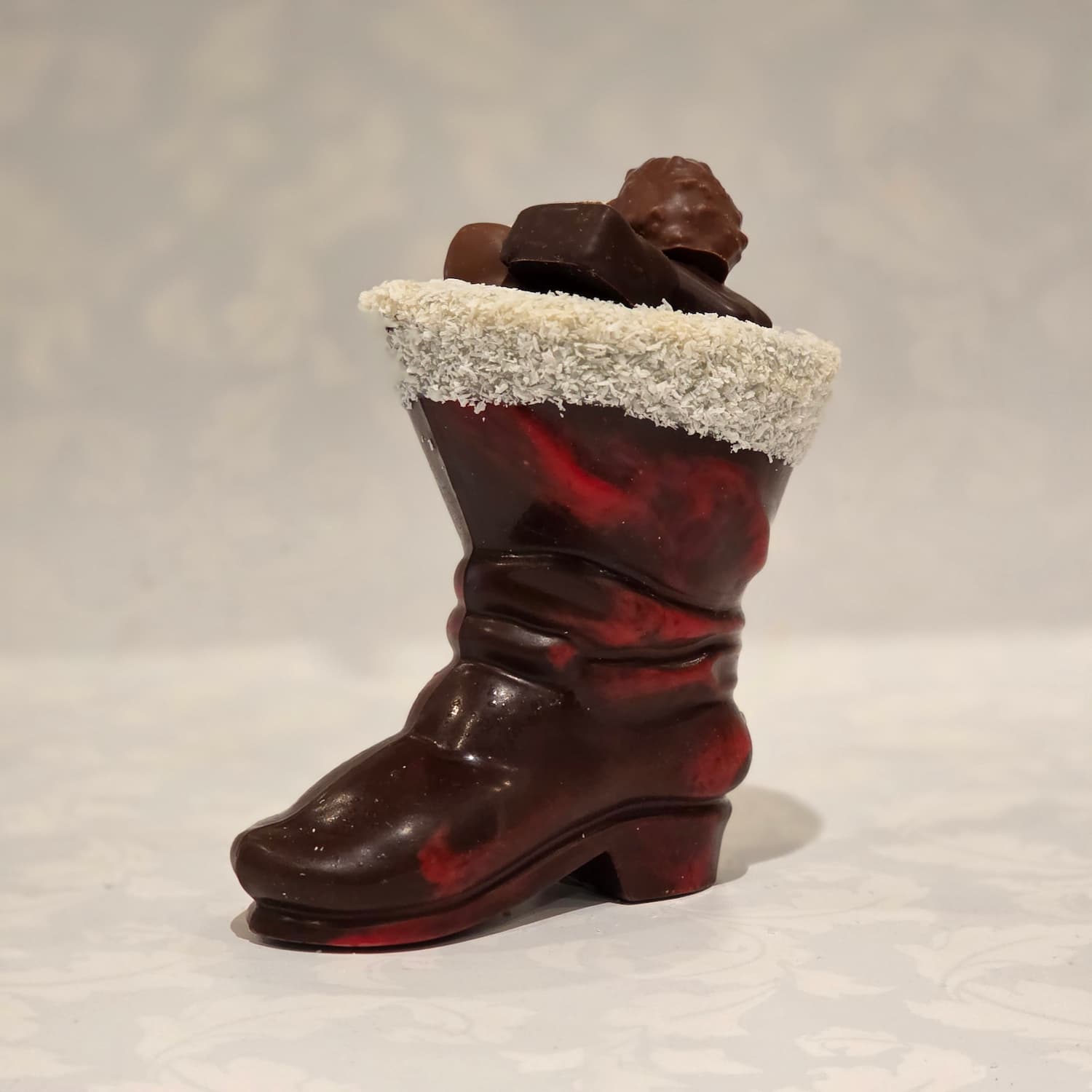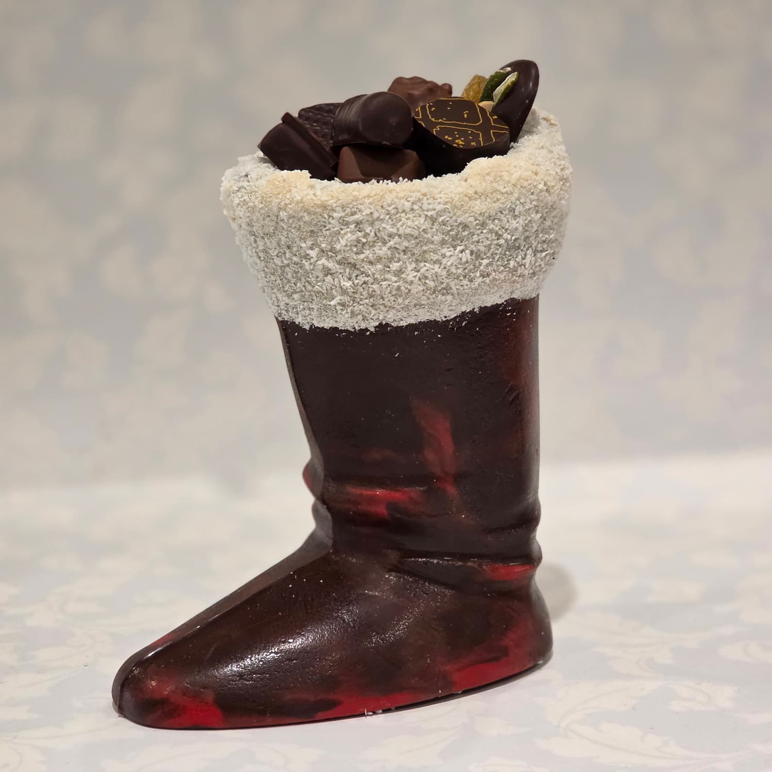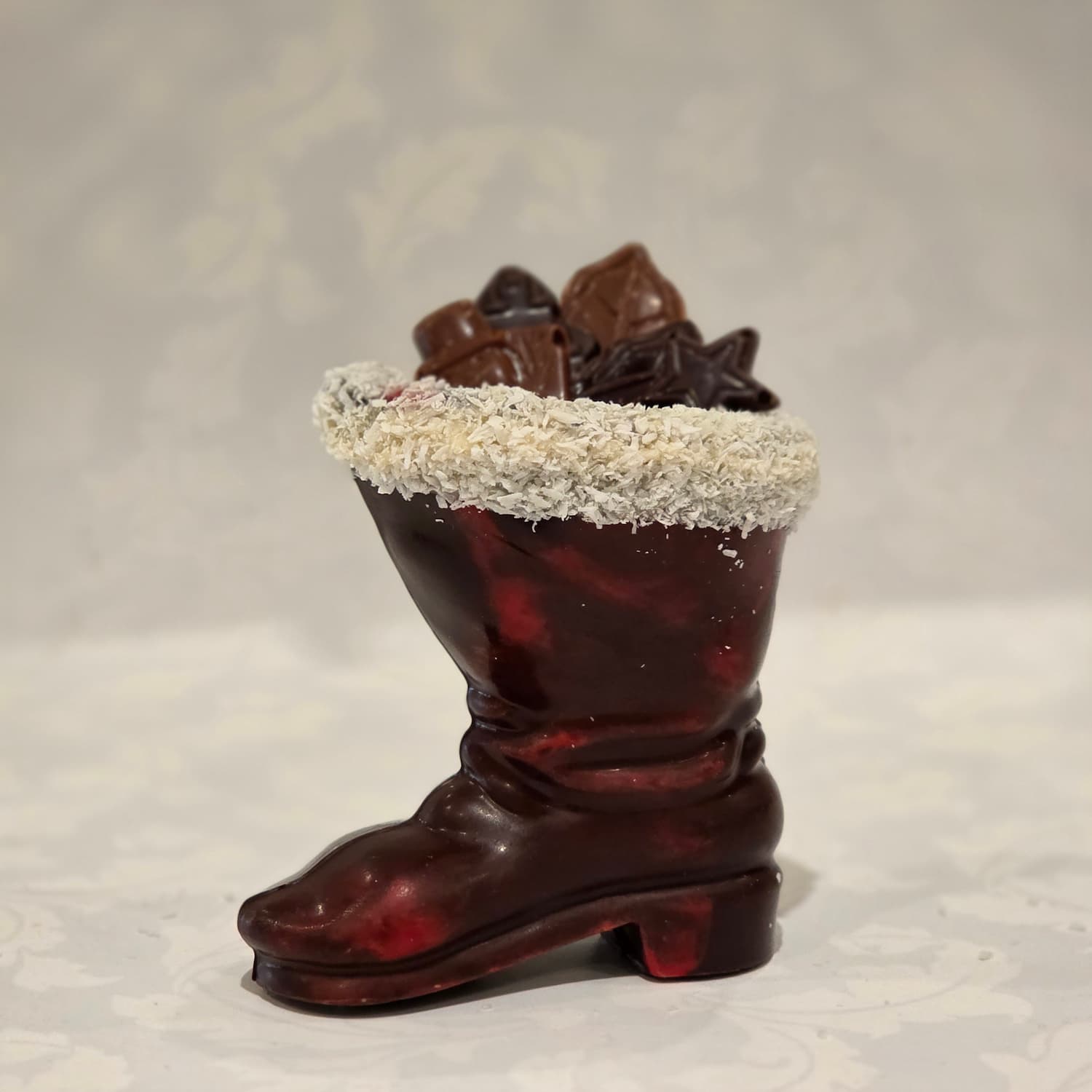 La véritable botte du père noël, en fourrure de coco, garnie de chocolats.