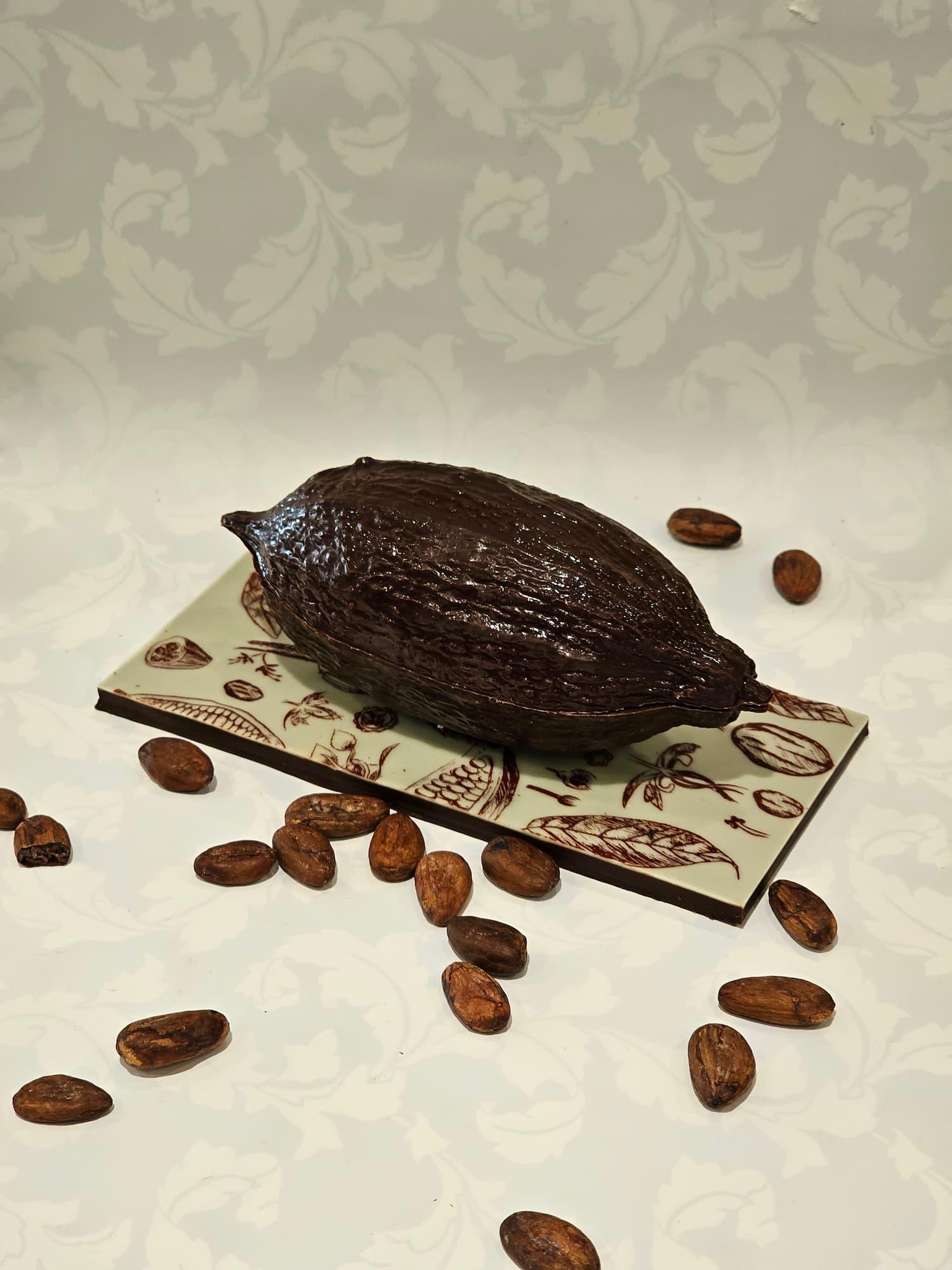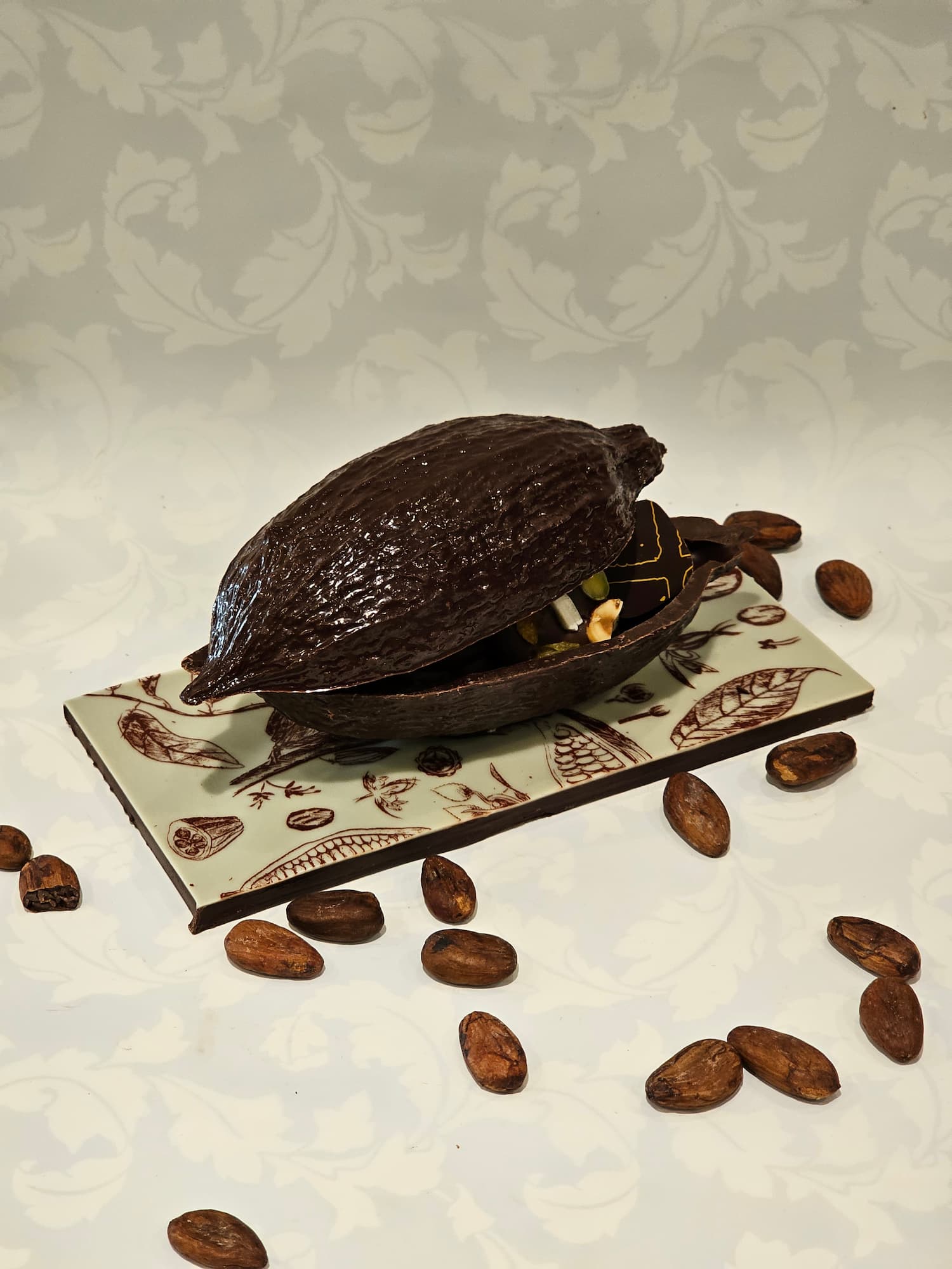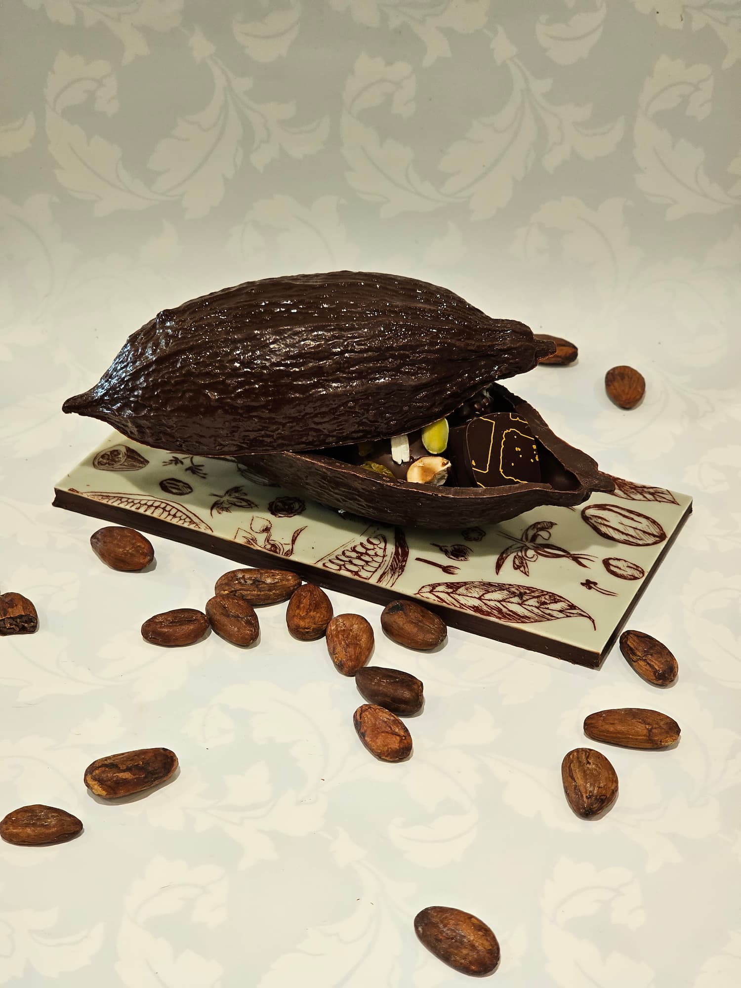 Une Cabosse en chocolat creuse garnis de chocolats fourrés.