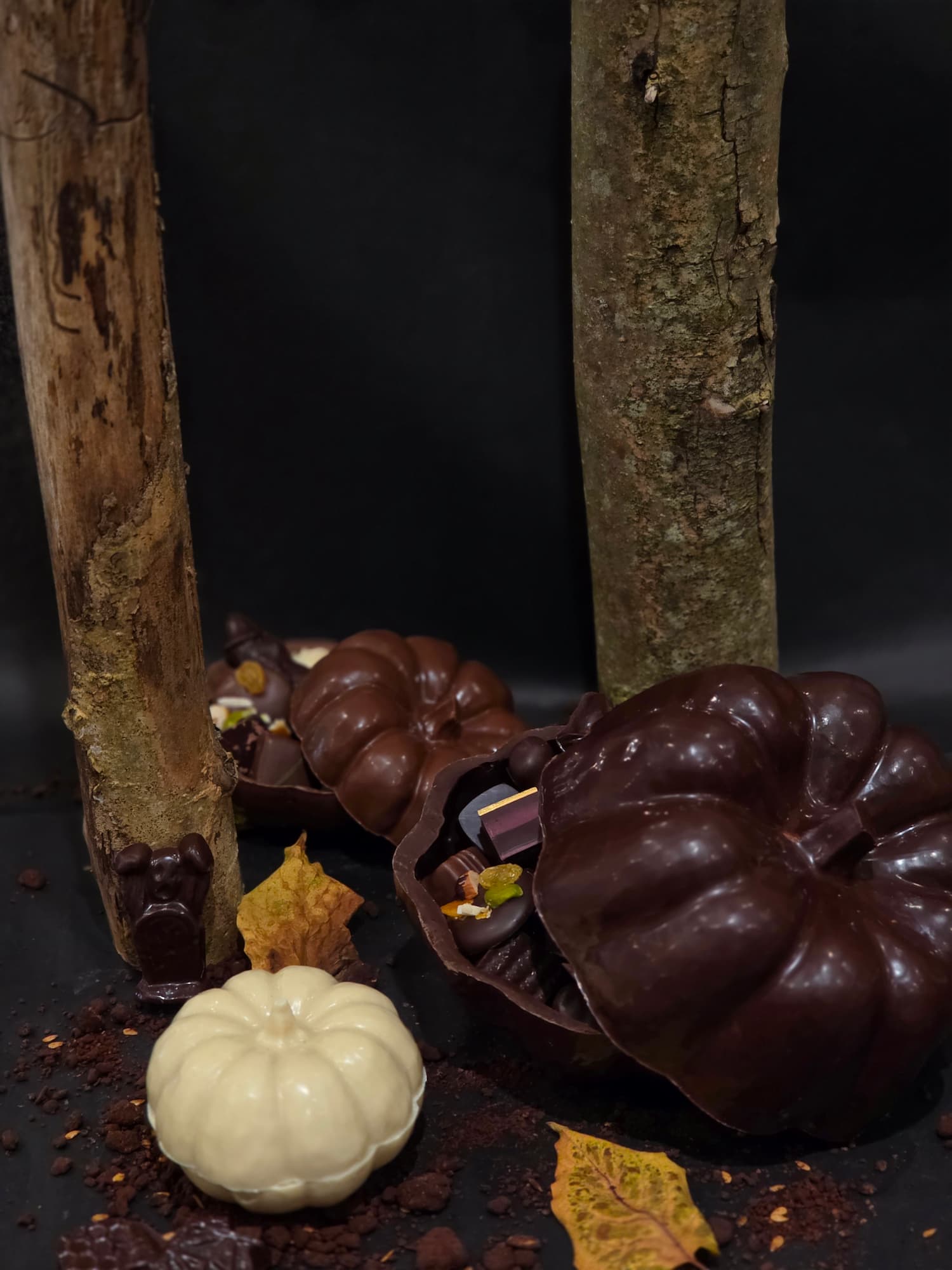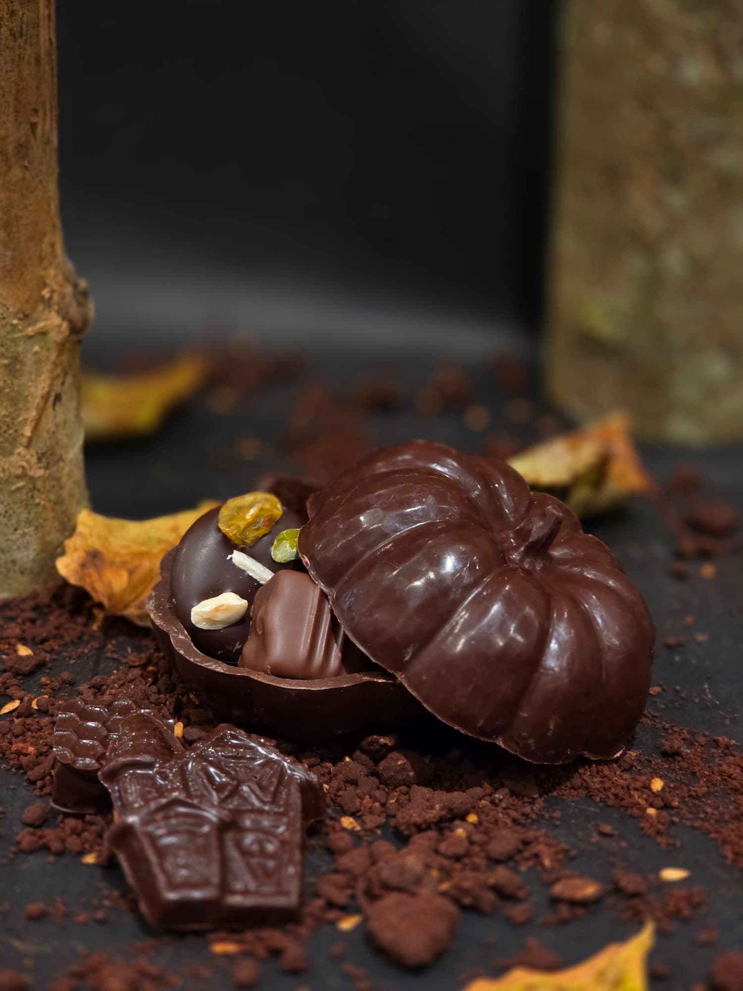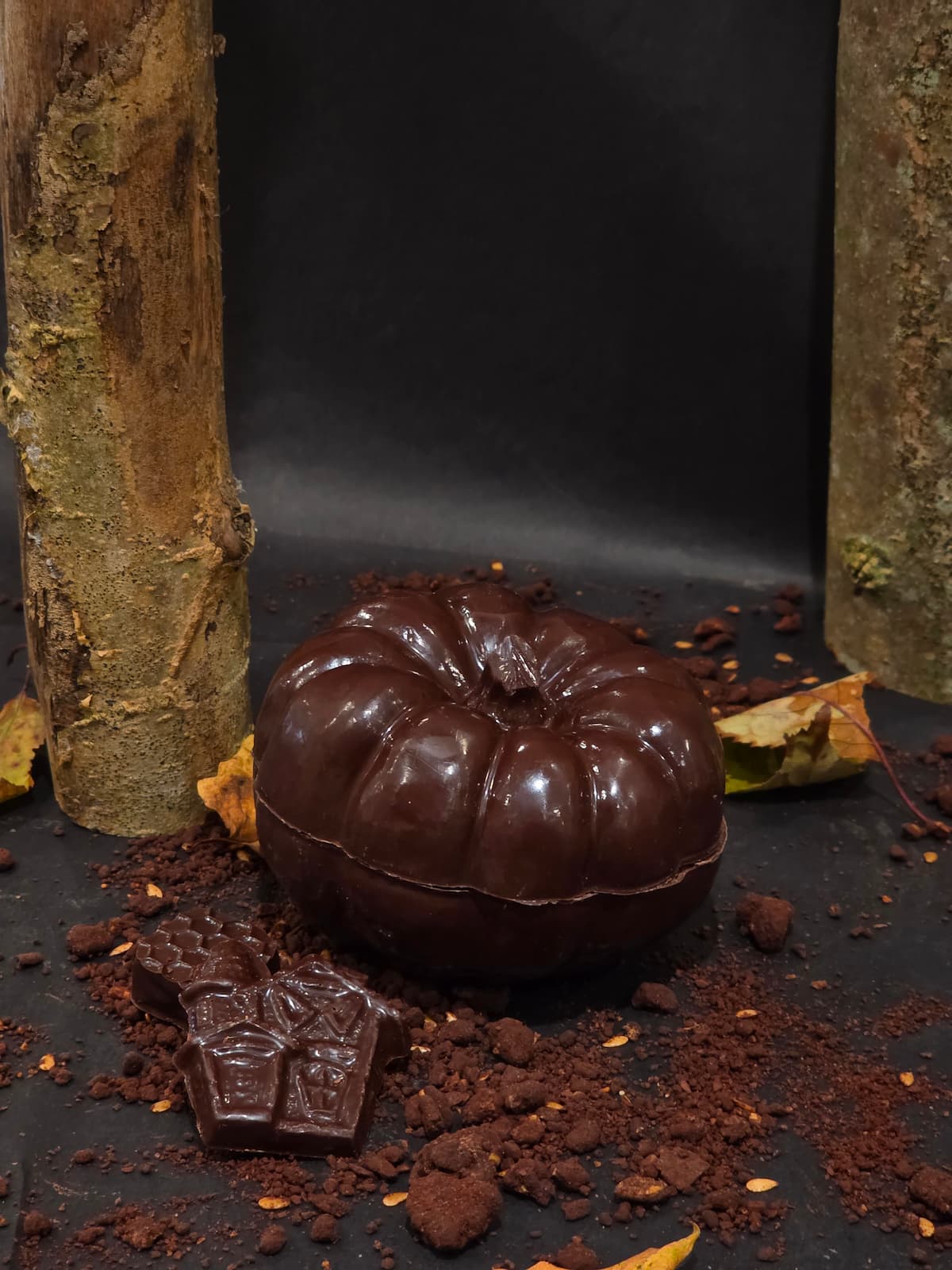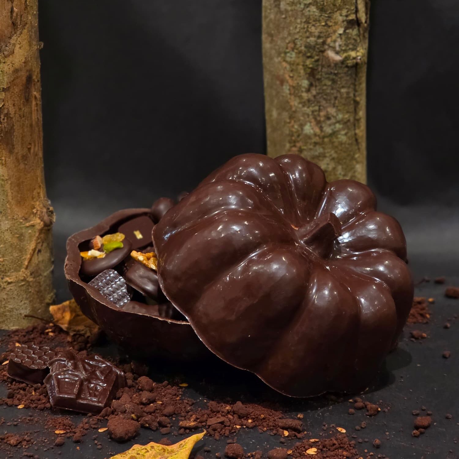 Une citrouille en chocolat Noir, Lait ou Blanc, disponible en 3 formats. Garnis de chocolats fourrées : 50g, 80g, 250g.