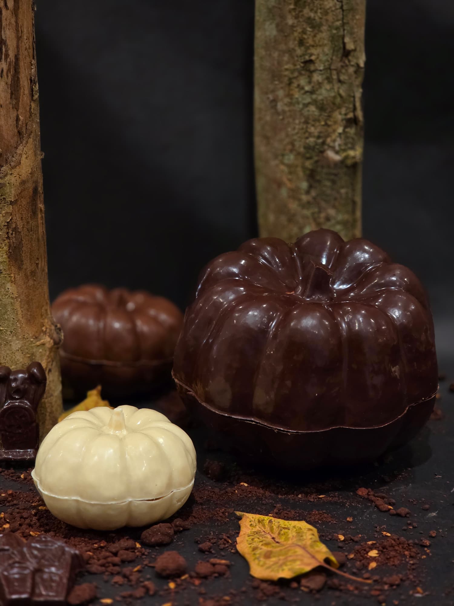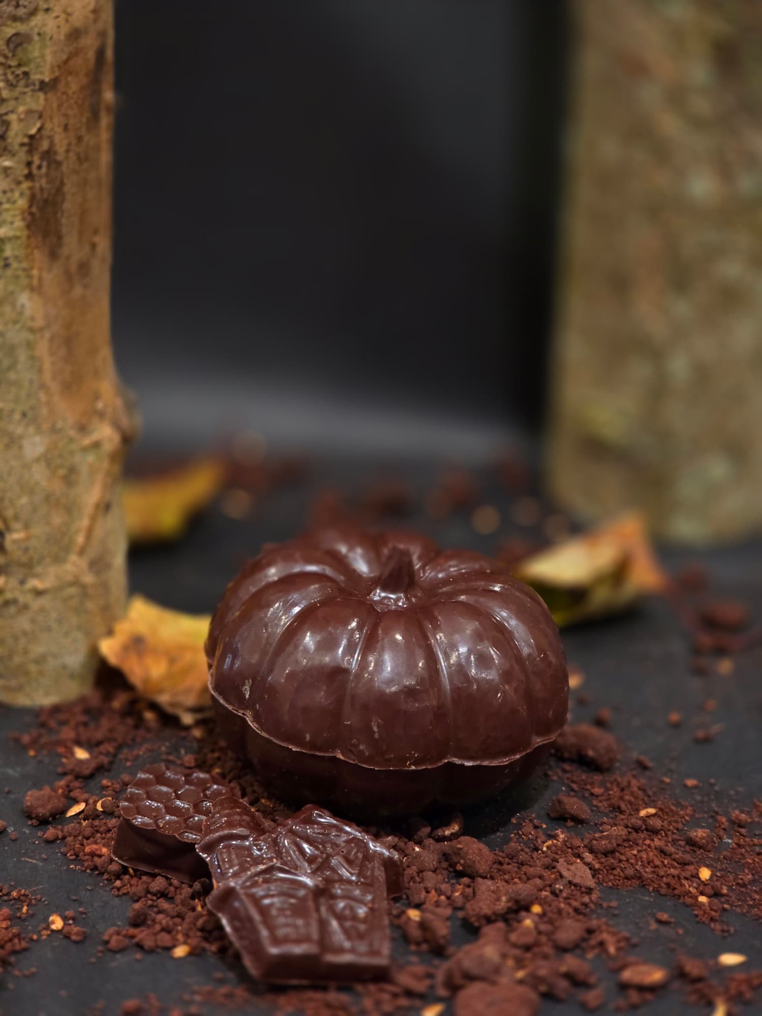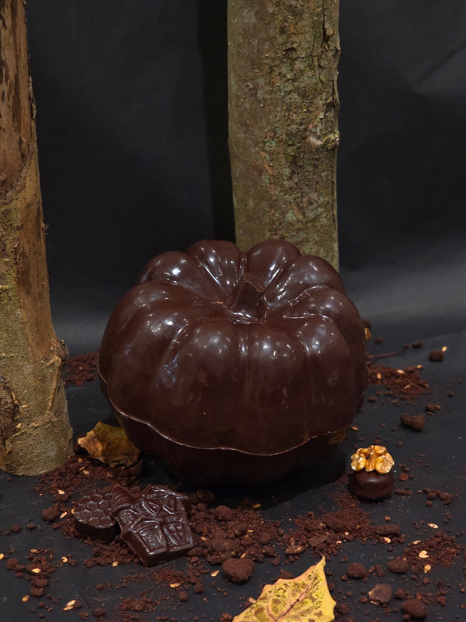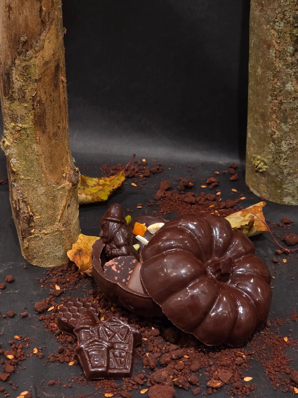 Une citrouille en chocolat Noir, Lait ou Blanc, disponible en 3 formats. Garnis de chocolats fourrées : 50g, 80g, 250g.